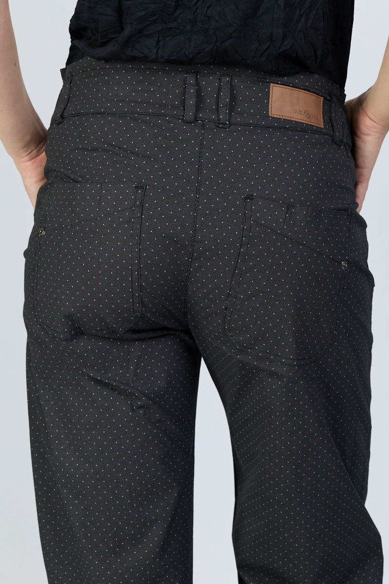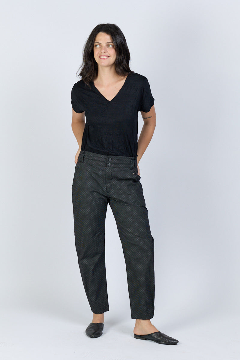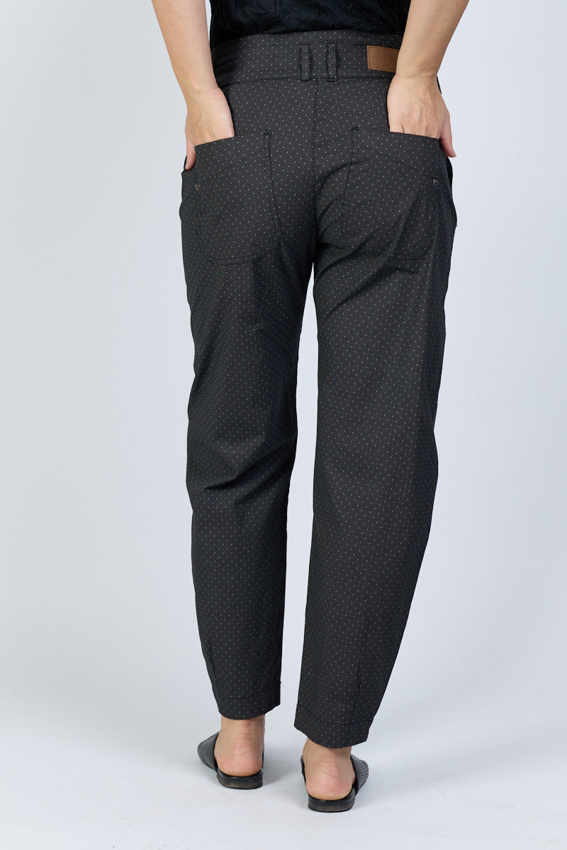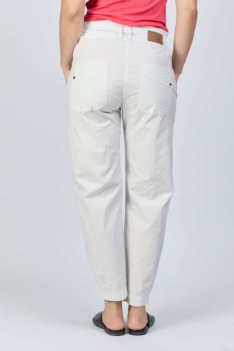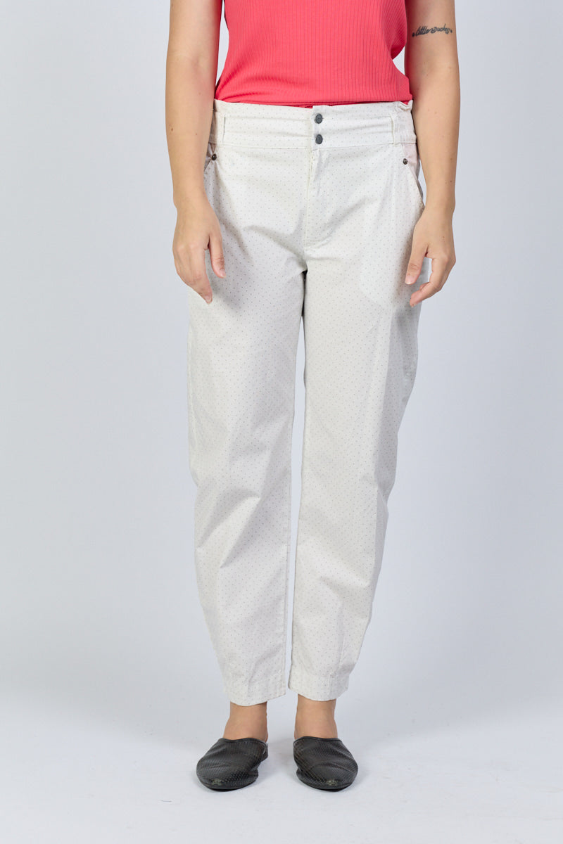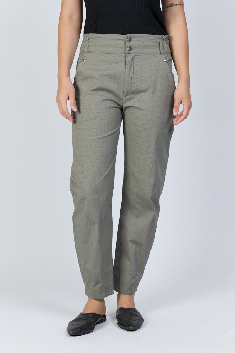 מכנסיים בגזרה קצת מעוגלת, עם חצי חגורת גומי מעוצבת